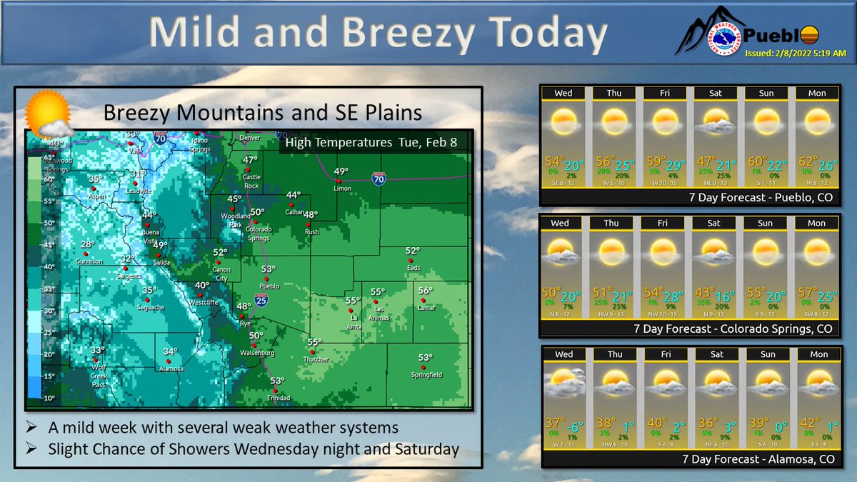 Mild and breezy today. A couple of disturbances will bring some brief shots of light snow showers Wednesday night and again Friday night into Saturday for the mountains and adjacent plains.