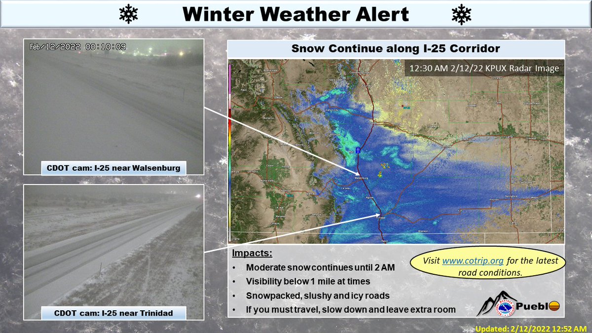 12:30 AM 2/12/22 Update: Moderate snow continues along the southern I-25 corridor but will decrease in intensity through 2 AM. Expect slick, slushy and snowpacked roads overnight, especially on untreated surfaces.