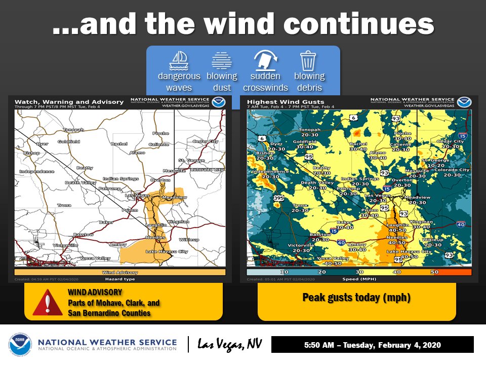 It's windy out there! High Wind Warning for Esmeralda and central Nye counties until 6 PM; Wind Advisory for the rest of S NV, SE CA, and NW AZ until 6 PM, except in SE San Bern Co and the CO River Valley, where it's in effect through Tuesday. Stay safe!pic.twitter.com/SewTX80Uap