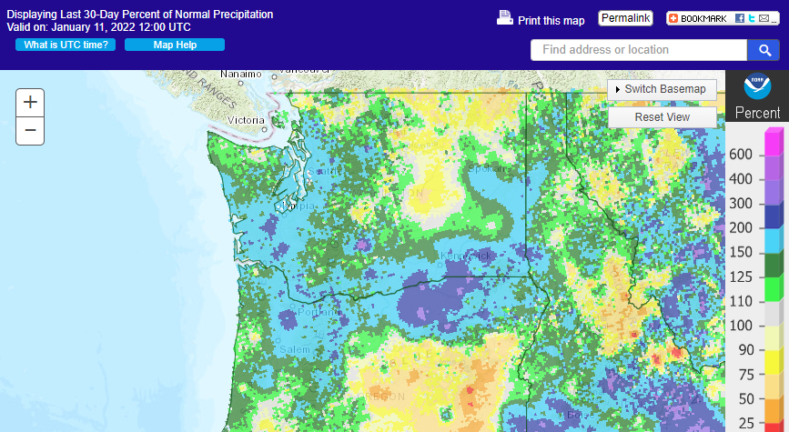 The one month precipitation anomaly is almost as impressive. Going back a full 365 days, western WA and far northwest OR has had above average rains/snows. The story is very different in the interior portions of WA and OR (Columbia & Harney Basins, respectively).pic.twitter.com/bbaIgMvD8E