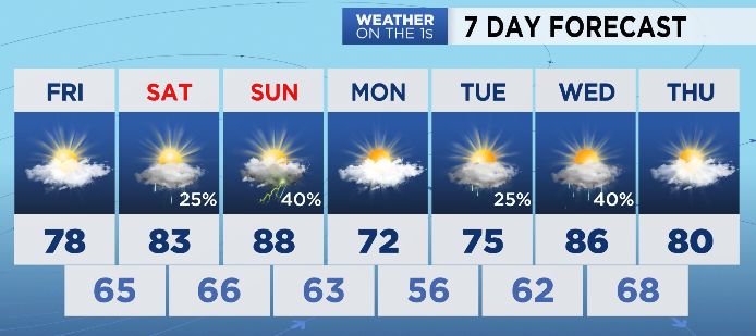 Update: Staying cool and dry tonight. Milder and brighter on Tuesday. Spring heat again Wednesday with spot storms. Washout for Friday. Cool Saturday with some showers.pic.twitter.com/nBBgUMecTO