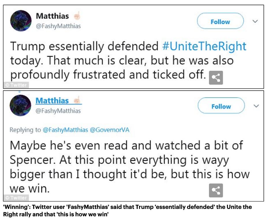 Matt Warner was active in the 2017 Unite the Right organizing chats & later defended UTR & the snowballing controversy on his suspended Twitter account @FashyMatthias. He believed UTR was how the Alt Right "would win" & also believed Trump defended the Far Right w/ his comments.pic.twitter.com/Xks8ATrZ30