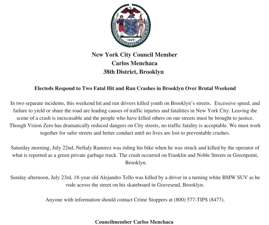 Electeds Respond to Two Fatal Hit and Run Crashes in #Brooklyn Over Brutal Weekend #VisionZeropic.twitter.com/O4Am5OGs5Q