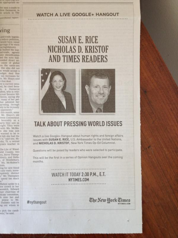 A25, today's @nytimes reminds you: tune in at 2:30 for live #nythangout w/ @NickKristof, @AmbassadorRice & NYT readerspic.twitter.com/ql8V0rNC