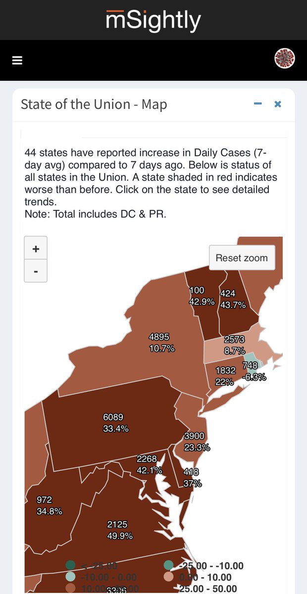New York: Week over week: Cases: up 11% Fatalities: up 25% Hospitalization: up 36% Tests: up 7% Positivity: up 8% https://www.msightly.com/covid-19/details.php?documentID=State%20of%20the%20Union%20-%20Map&documentName=State%20of%20the%20Union%20-%20Map&eventID=9999&category_id=COVID-19%20Testing&category=COVID-19%20Testing&objectID=257 …pic.twitter.com/WZmkZMtwsi