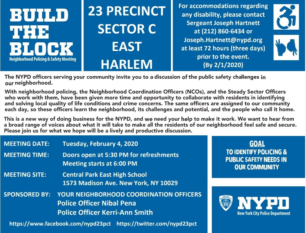 Coming to NCO David’s #BuildTheBlock meeting? On 5/18/2023 our #PoliceOfficers will be at 1325 5th Avenue at 6:00 PM and will be happy to address your questions, comments, and concerns. Let’s work together to make #eastharlem safe.