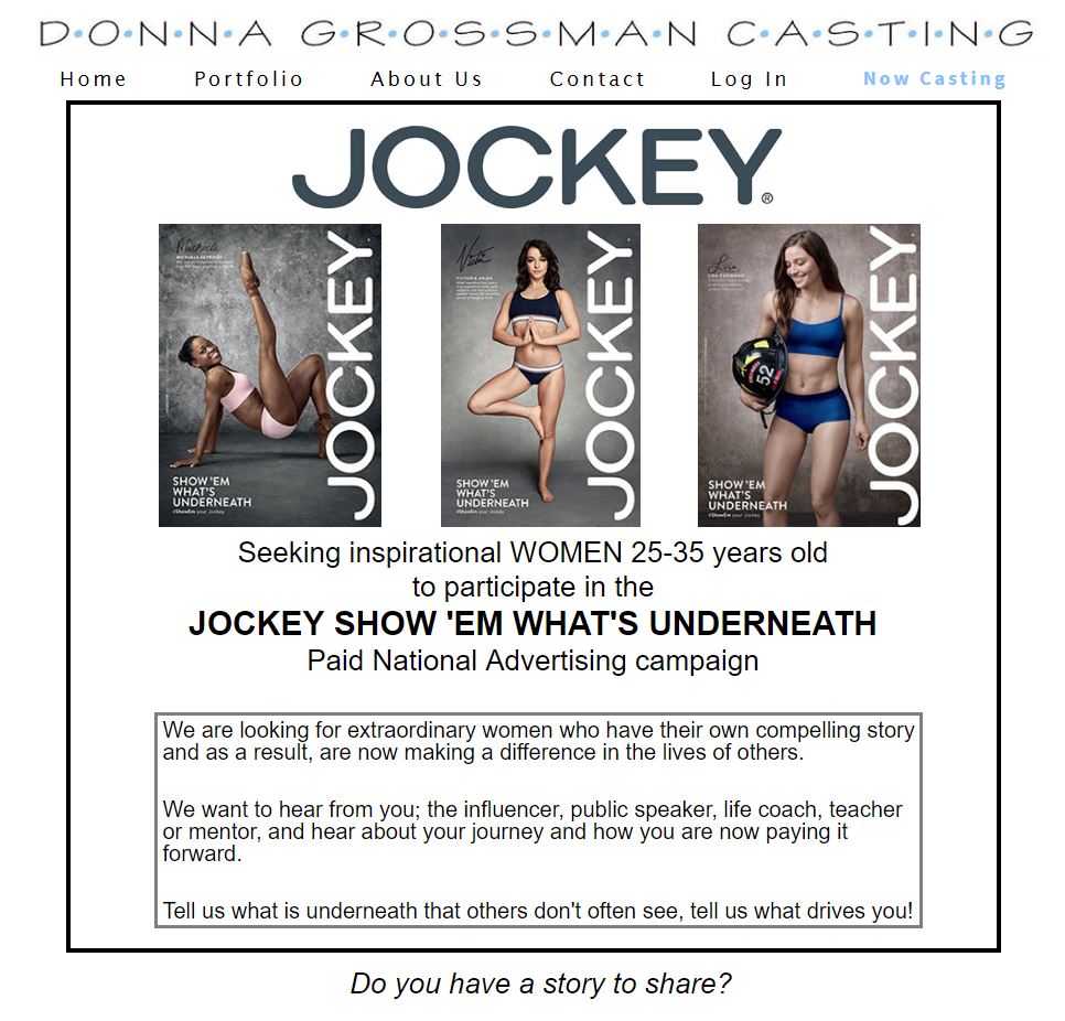 We are looking for an incredible Police Woman to be in the next Jockey Advertising Campaign. This is a well paid advertising shoot about people who go above and beyond. www.donnagrossmancasting.comk/jockey.html