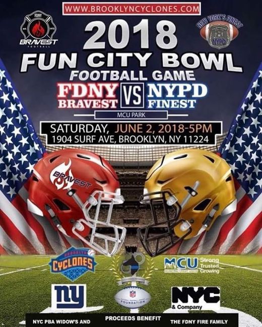 Still working on your plans for the weekend? Come cheer on @FinestFootball as they play against rivals @FDNY in their annual game at MCU Park in #ConeyIsland tomorrow. More info at @BKCyclones http://ow.ly/CjDr30kise2 pic.twitter.com/UuPZdXTCYx