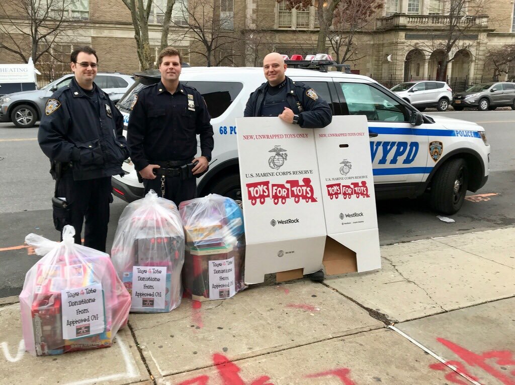Officers from the @NYPD68Pct are getting in the holiday spirit by lending a hand to the @USMC reserves as they collect donations for #ToysForTots. To find a drop off location for toy donations follow the link: http://ow.ly/lAwI50jRgdj pic.twitter.com/I0sYURJL82