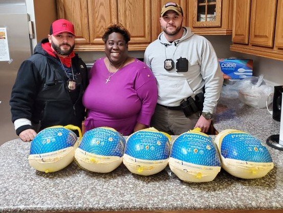 Seven turkeys total...two standing next to the woman. Gobble gobble!