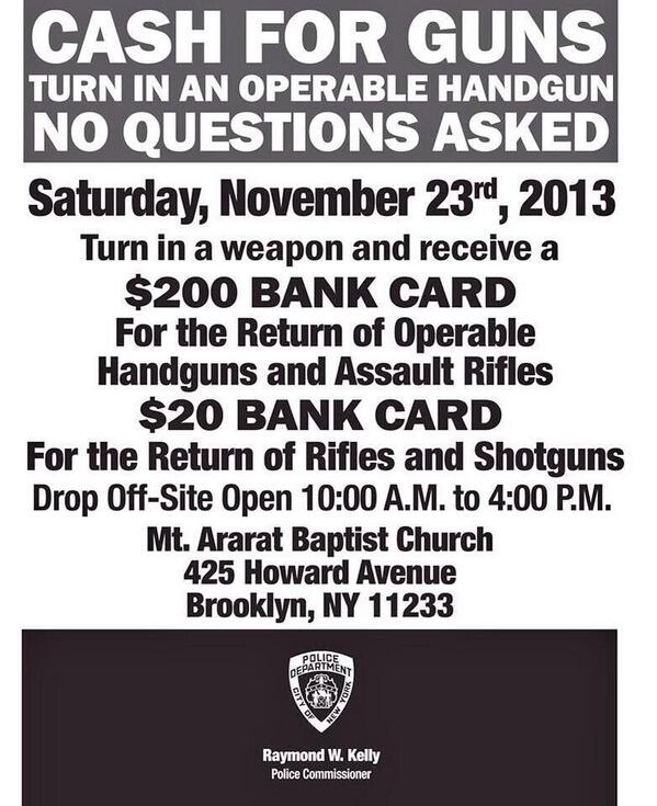 @NYPDnews: TODAY 10a-4p CASH FOR GUNS - turn in guns and receive up to $600 - 425 Howard Ave Brooklyn https://twitter.com/NYPDnews/status/404246935391199232/photo/1Naada …... la llevemos