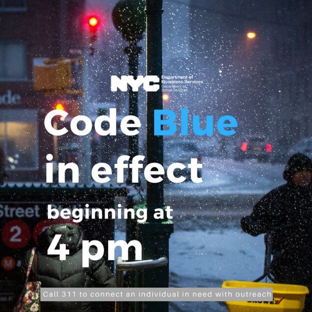 Temps below freezing tonight. If you see anyone at risk, especially those living on the street, call 311 so @NYCDHS can help them. #CodeBluepic.twitter.com/RYBcfIlHD0