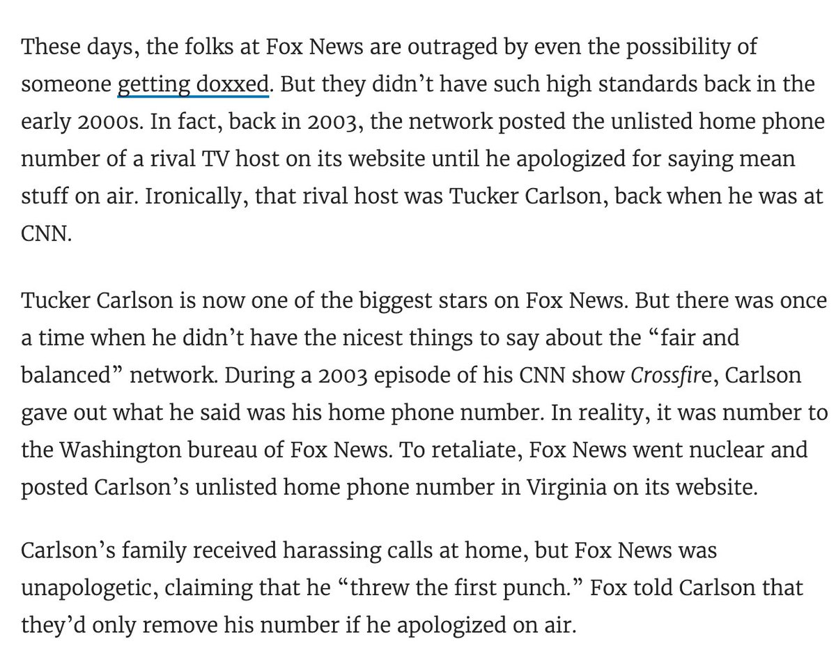 Is it more likely that NYT would suddenly, after 169 years, start doxxing people for fun, or is it more likely Tucker is lying to distract from the sexual harassment lawsuit?