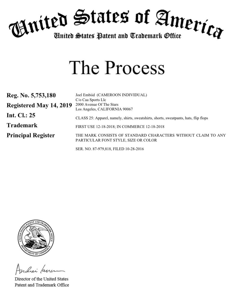 @JoelEmbiid the registered owner of one trademark for “The Process.” Embiid has 20 other applications for the mark pending. First reported by@JoshGerben.pic.twitter.com/TETxjijbr2