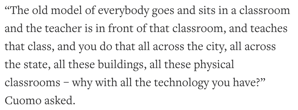 Anybody who thinks teachers just "stand in front of a class" hasn't stepped foot in a school since the last century. This is insulting to all of us who create vibrant learning environments that cannot be replicated remotely.