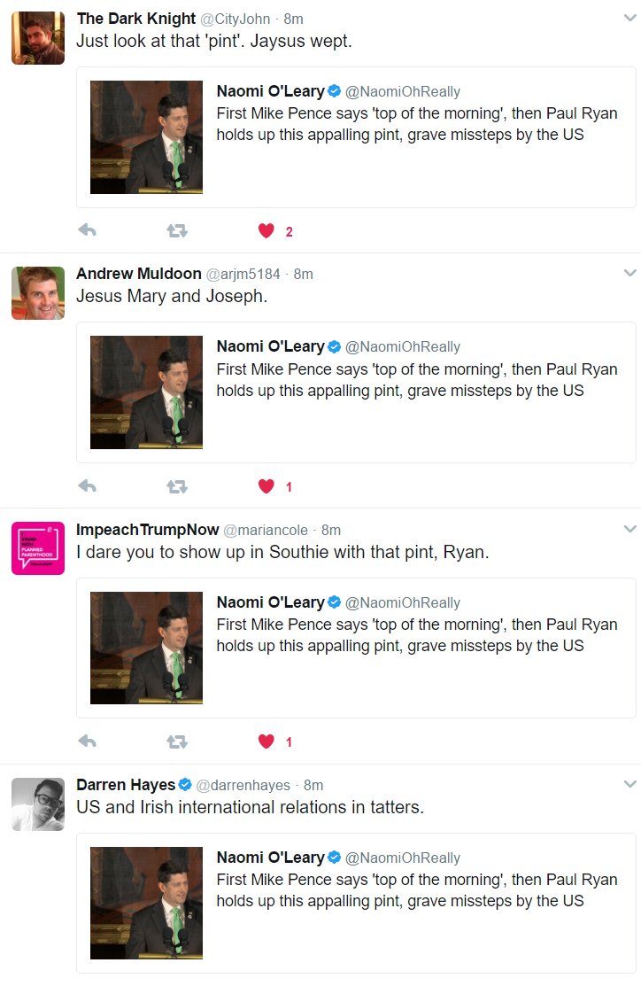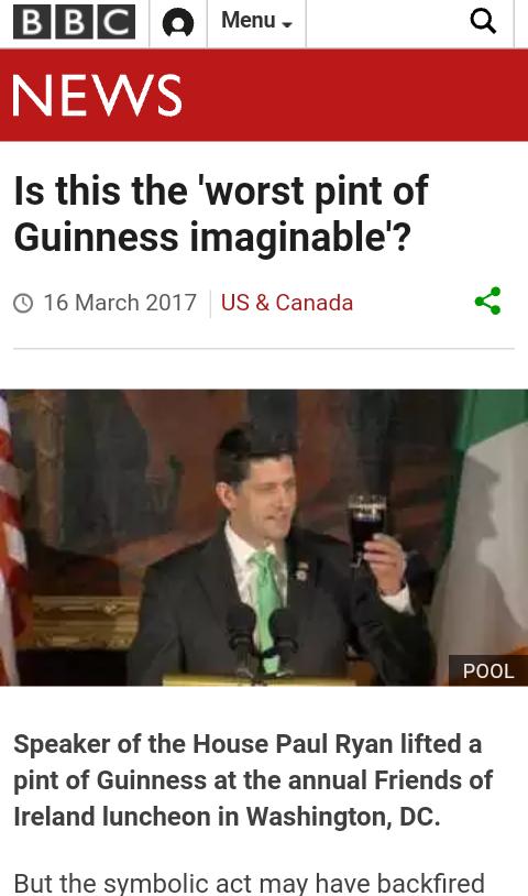 First Mike Pence says 'top of the morning', then Paul Ryan holds up this appalling pint, grave missteps by the USpic.twitter.com/U4ktqf0Aag