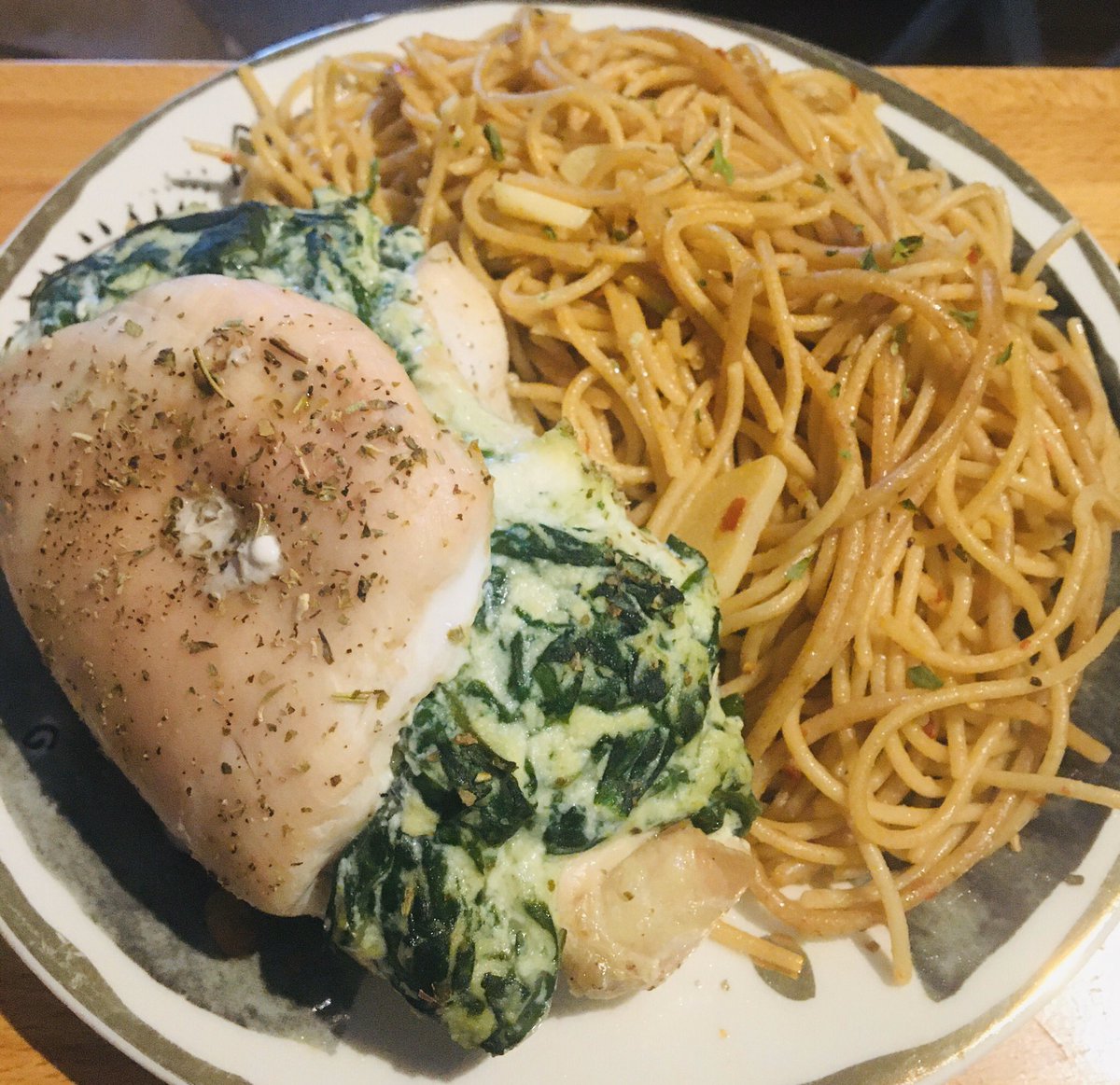 Concluded a productive day with spinach and ricotta-stuffed chicken and pasta with a spicy garlic aioli! I usually follow recipes, but this overflowing monstrosity was made on the fly!
