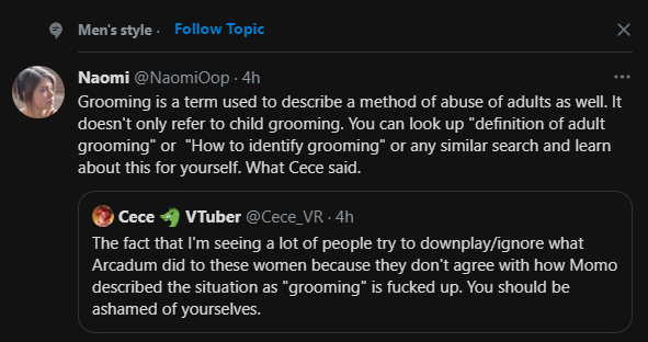 Grooming is a term used to describe a method of abuse of adults as well. It doesn't only refer to child grooming. You can look up "definition of adult grooming" or "How to identify grooming" or any similar search and learn about this for yourself. What Cece said.https://twitter.com/Cece_VR/status/1432597473135005700 …