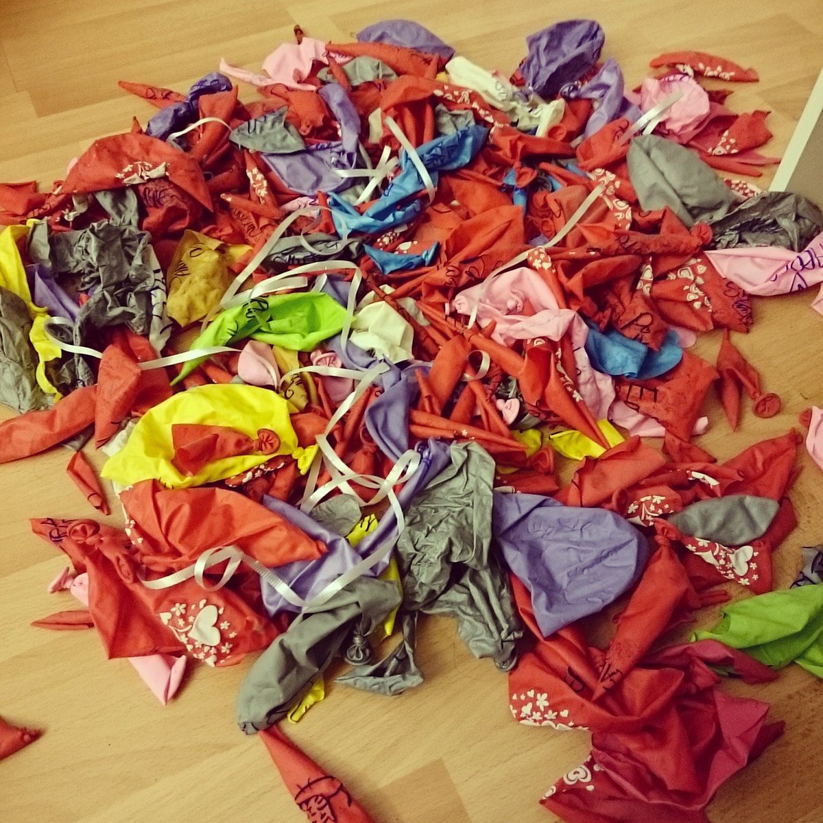This is February's balloon graveyard. Rest in pieces, most valued rubbery friends.