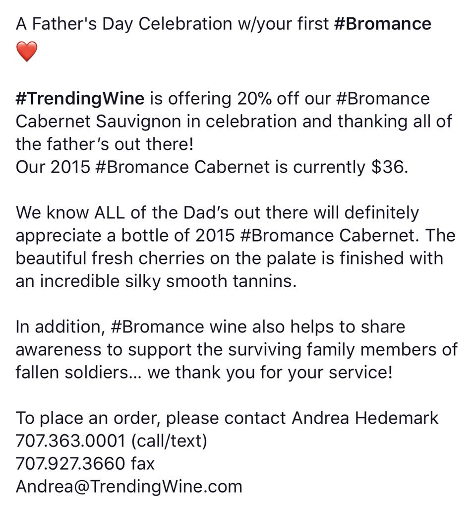 #FathersDay promo for the#coolest dad in your#life. Pick up a bottle of#bromance or I’d be happy to ship it to you!#Fathersday2018#fathersdaygifts#NapaValley#winepic.twitter.com/4XklciqaCh