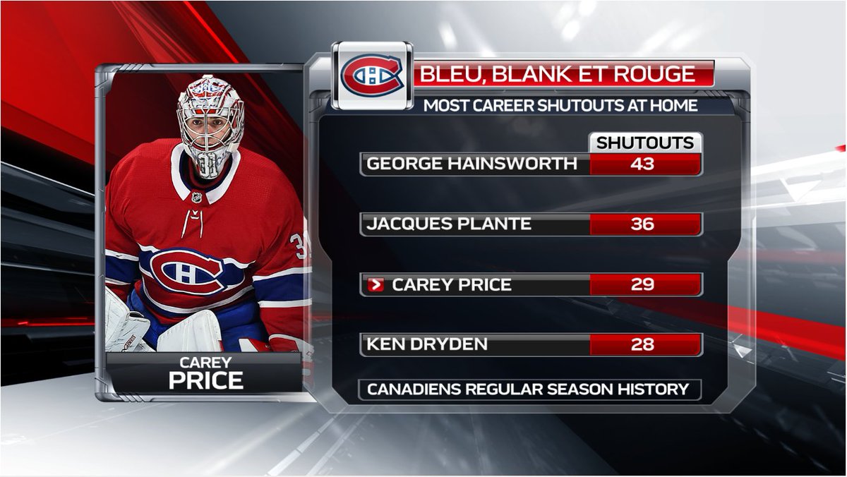 Carey Price turned aside 33 shots from the Canucks tonight, earning his 42nd career shutout but his 29th in the friendly confines of home- puts him 3rd on this all-time