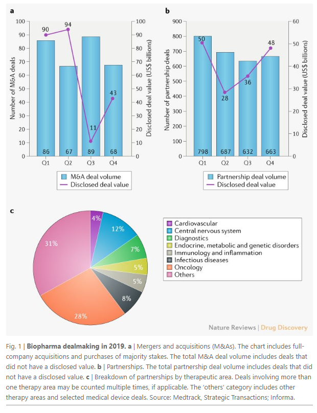 #biopharma M&A from@NatRevDrugDisc A total of $238B was spent in 2019 across 310 transactions.#Oncology-related deals represented the most by volume, contributing to 28% of the total. Article: https://www.nature.com/articles/d41573-020-00003-5 …pic.twitter.com/wmUEOun6sJ