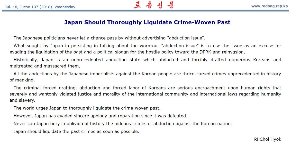 "The Japanese politicians never let a chance pass by without advertising 'abduction issue'. [...] Historically, Japan is an unprecedented abduction state which abducted and forcibly drafted numerous Koreans and maltreated and massacred them."pic.twitter.com/fQ8oaTUcCH