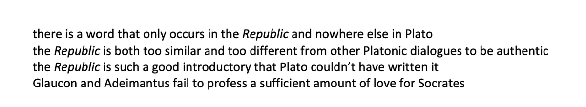 pretty tempted to produce a parody article arguing against the authenticity of the Republic using the same arguments that are made agst the Alcibiades https://twitter.com/AgnesCallard/status/1289635185689071619 …pic.twitter.com/rMauw53Byp