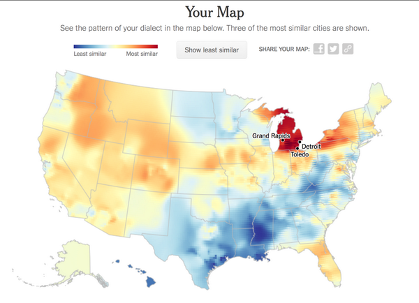 Results, as a heatmap, of my NYT dialect quiz. Corresponds quite well to where I've lived. http://www.nytimes.com/interactive/2013/12/20/sunday-review/dialect-quiz-map.html …pic.twitter.com/j1YP33V0lm