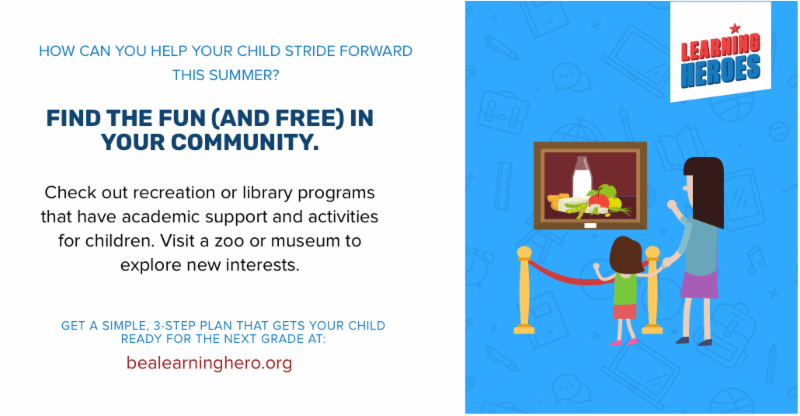 This summer, check out recreation or library programs that have academic support and activities for kids. Visit a zoo or museum to explore new interests. Find the fun (& free) in your community! Find more at http://bit.ly/1MApXfm via @BeALearningHeropic.twitter.com/wF6VT1GRhQ