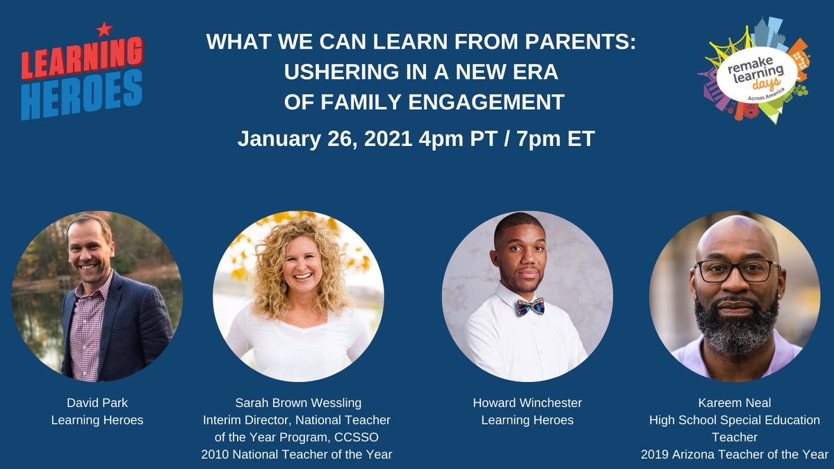 We can learn a lot by listening to parents. Join @BeALearningHero & @remakelearning TODAY at 7pm ET for their 1st Remake Learning Days Educator Webinar. Experts will be available to talk about family engagement practices during remote learning. Register: http://bit.ly/38CmJwD pic.twitter.com/azD5ze5heL