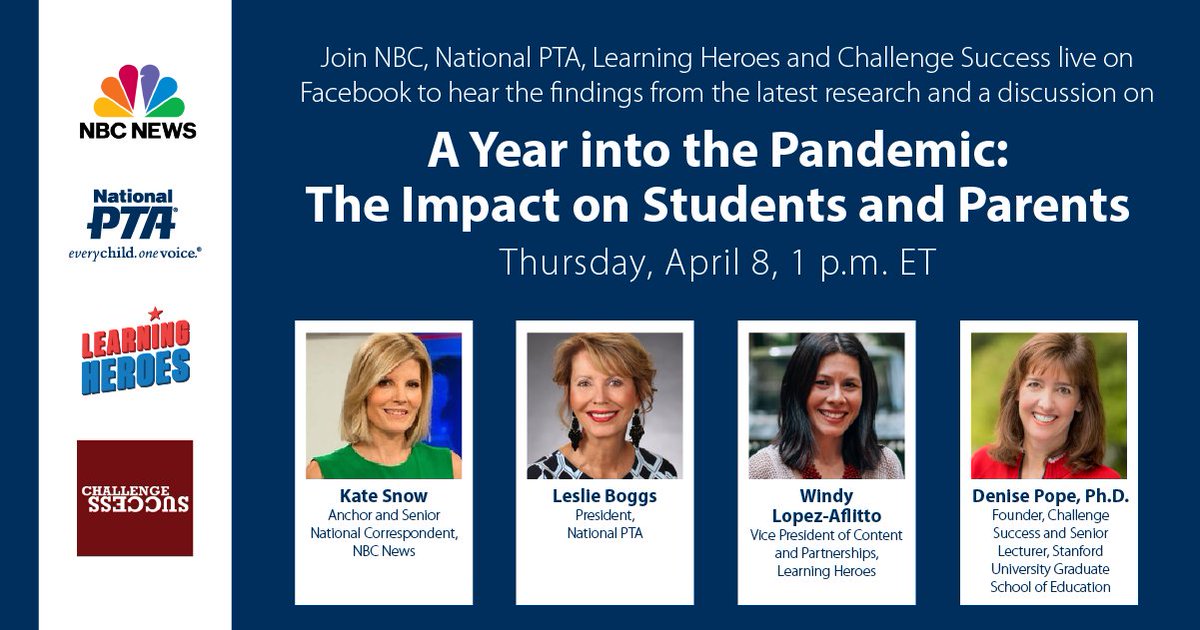 Join us LIVE on Facebook for this special event, "A Year into the Pandemic: The Impact on Students and Parents," as a panelist of experts share the important information and resources you need. Thursday, April 8 1 p.m. ET Watch live at http://Facebook.com/ParentTeacherAssociation …pic.twitter.com/z8Ne6yYcco
