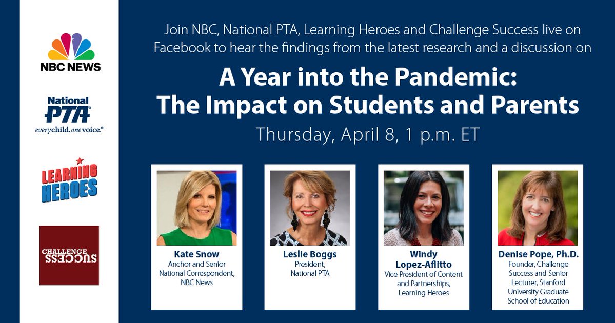 Join us LIVE on Facebook for this special event, "A Year into the Pandemic: The Impact on Students and Parents," as a panelist of experts share the important information and resources you need. Thursday, April 8 1 p.m. ET Watch live at http://Facebook.com/ParentTeacherAssociation …pic.twitter.com/UoZUCBUxhL