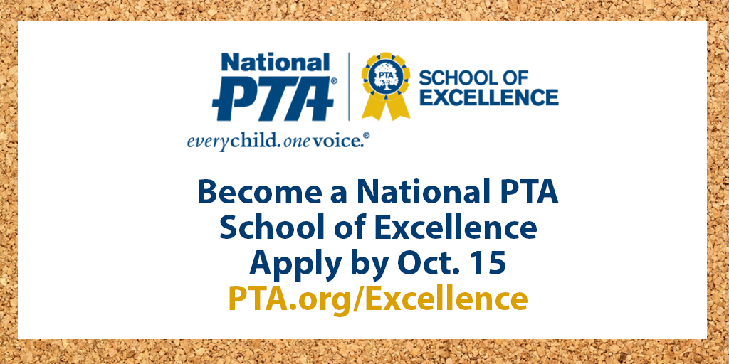Deadline to become a @NationalPTA School of Excellence is Oct. 15. http://bit.ly/1KZSZ9D pic.twitter.com/xnvbDgTUUa