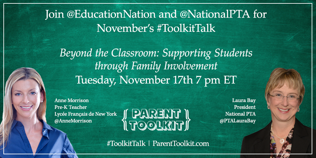 Join @PTALauraBay and @AnneEMorrison for tonight's #ToolkitTalk with @educationnation!https://twitter.com/educationnation/status/666722501230067713 …