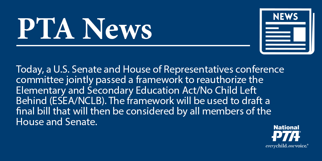 National PTA Commends Passage of Bipartisan Agreement to Reauthorize #ESEA #PTATakesAction http://bit.ly/1jadOFt pic.twitter.com/L6W3MSBz6L