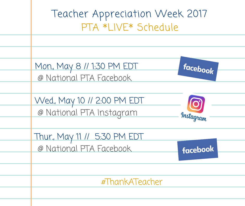 Join us for special PTA LIVE celebrations throughout Teacher Appreciation Week and the reveal of our #ThankATeacher Contest winners!pic.twitter.com/jTYDgVK6dM