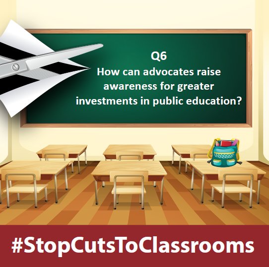 Q6: How can advocates raise awareness for greater investments in public education? #STOPCutsToClassroomspic.twitter.com/96sgkaEQfm