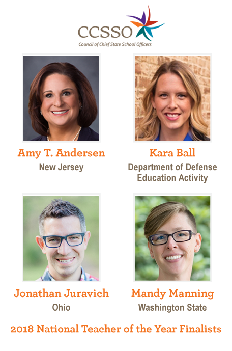 One of these four teachers will be named 2018 National Teacher of the Year! Meet the four finalists! #ntoy18https://twitter.com/CCSSO/status/948963154456973312 …