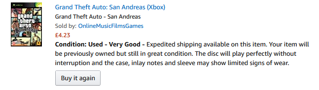 So, I finally got a replacement for this order and I noticed that GTA San Andreas disc is scratched to damn. Do they get these games from a trash can or something? How can it be "Very Good" condition. Luckily I got a refund.💩 https://twitter.com/NationalPepper/status/1143583038003142656 …pic.twitter.com/6rEXFJxJq0
