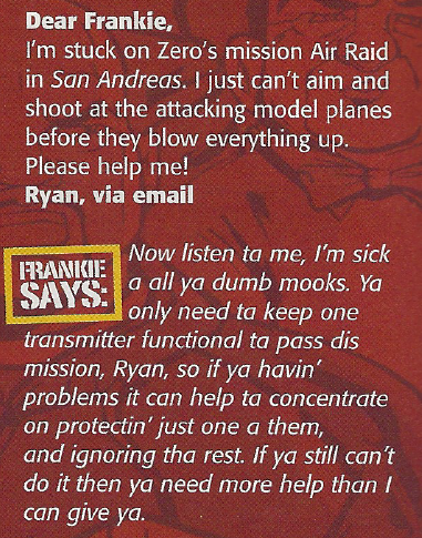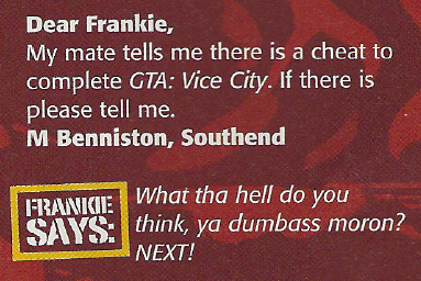 There was a popular "GTA Wiseguys" section in PowerStation magazine, where you could send them a question and hopefully "Frankie" would reply to you.