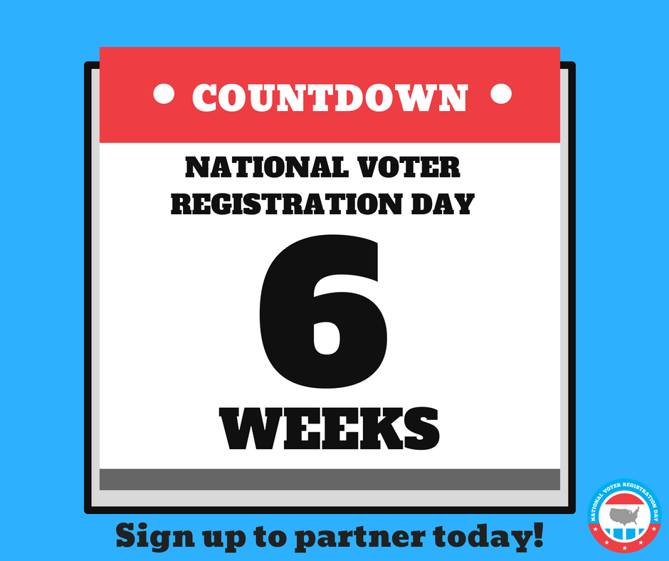 We're excited, are you? We're only six weeks away from #NationVoterRegistrationDay! Mark your calendars and be sure to sign up as a partner http://bit.ly/signup4NVRD #GoVotepic.twitter.com/qbAaE2YaLr