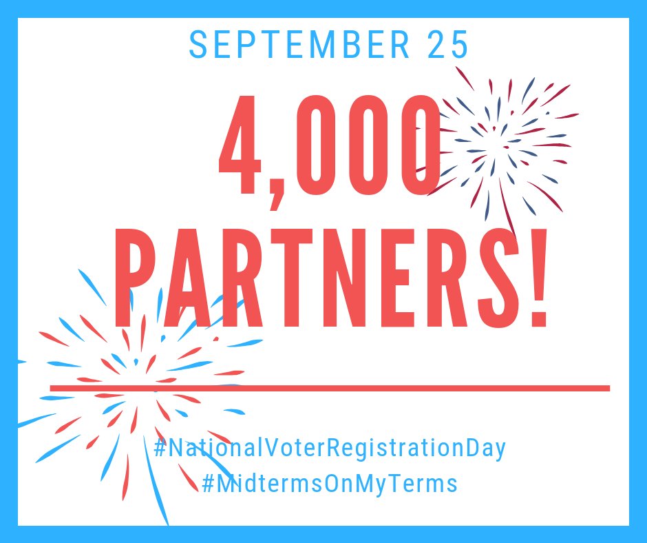 We just reached 4,000 COMMUNITY PARTNERS for #NationalVoterRegistrationDay which is a record! Shout out to: @OSUVotes This means we are equipped to register more voters than ever before! Lets GO! #MidtermsOnMyTerms