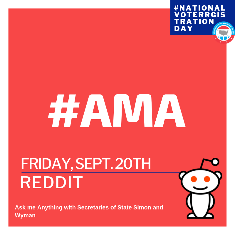 Keep an eye out for our #AMA tomorrow on Reddit (@reddit ) with Secretaries of State Simon and Wyman. @MNSteveSimon @secstatewa . You can ask them anything in prep for #NationalVoterRegistrationDaypic.twitter.com/Qq3aPCAPAE