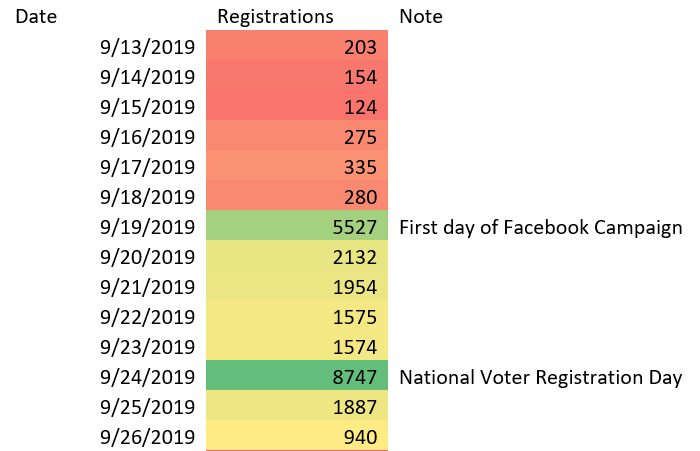 #NationalVoterRegistrationDay was a big success in Illinois! Numbers spiked as soon as @facebook promotion started on Sept. 19 and continued even after NVRD on Sept. 24. If you haven't registered yet, click here and get started: https://ova.elections.il.gov/  pic.twitter.com/i5aqTf6HsS