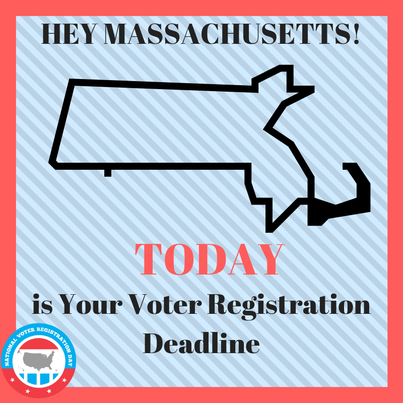 SHARE THIS: Do you live or work in #Massachusetts? TODAY is your voter registration deadline. Make sure you and everyone you know is #VoteReady!pic.twitter.com/YGMRRjp5Ks