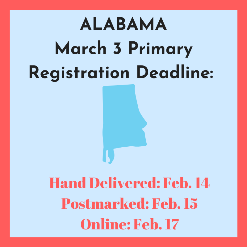 CALLING ALL ALABAMIANS: Before you head out for #ValentinesDay dinner, make sure you drop off your registration because TODAY is your deadline for hand delivered registrations for the 3/3 primary! If you miss it, you still have a little bit of time still. See the graphic below.pic.twitter.com/eMEkYnDJAi
