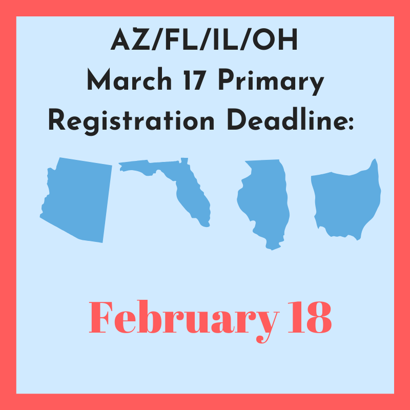 TODAY is the day to get registered if you want to vote in the March 17 primaries in #Arizona, #Illinois, #Florida and #Ohio!pic.twitter.com/fFYJeVc1b0