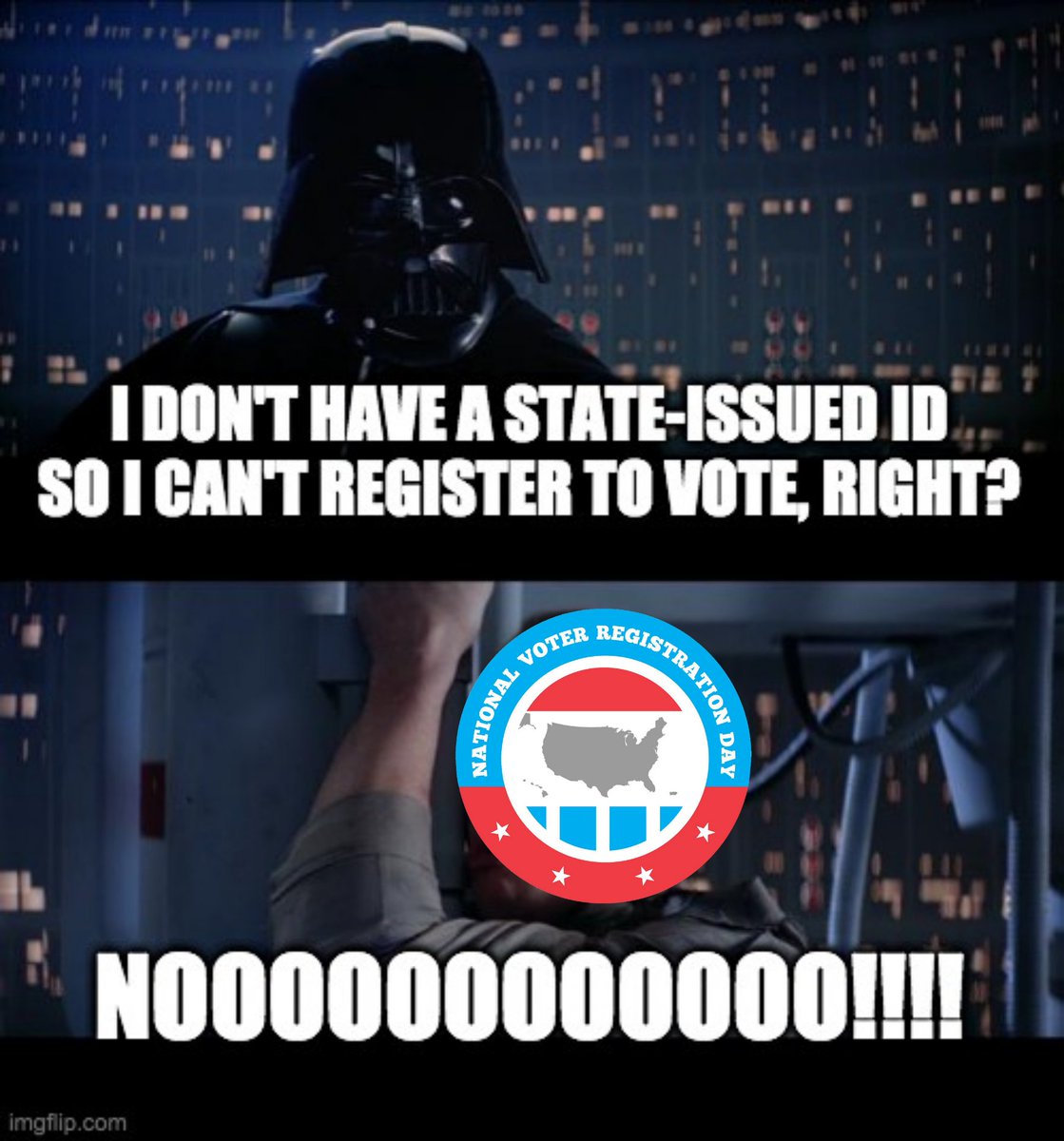 Not only is @DarthVader a bad dad, but his knowledge of voter registration is appalling! We’re not gonna “force” this on you but check out this page to learn more -- http://nationalvoterregistrationday.org/debunking-voter-registration-myths/ … #NationalVoterRegistrationDay #Maythe4thBeWithYou.pic.twitter.com/AaQ3T0RhMD