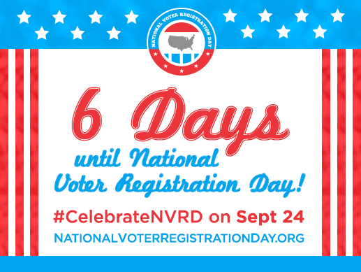 Sept. 24, a.k.a. National Voter Registration Day, is 6 days away! Visit http://bit.ly/vG2IyD now. #CelebrateNVRDpic.twitter.com/daZYL7G5eT